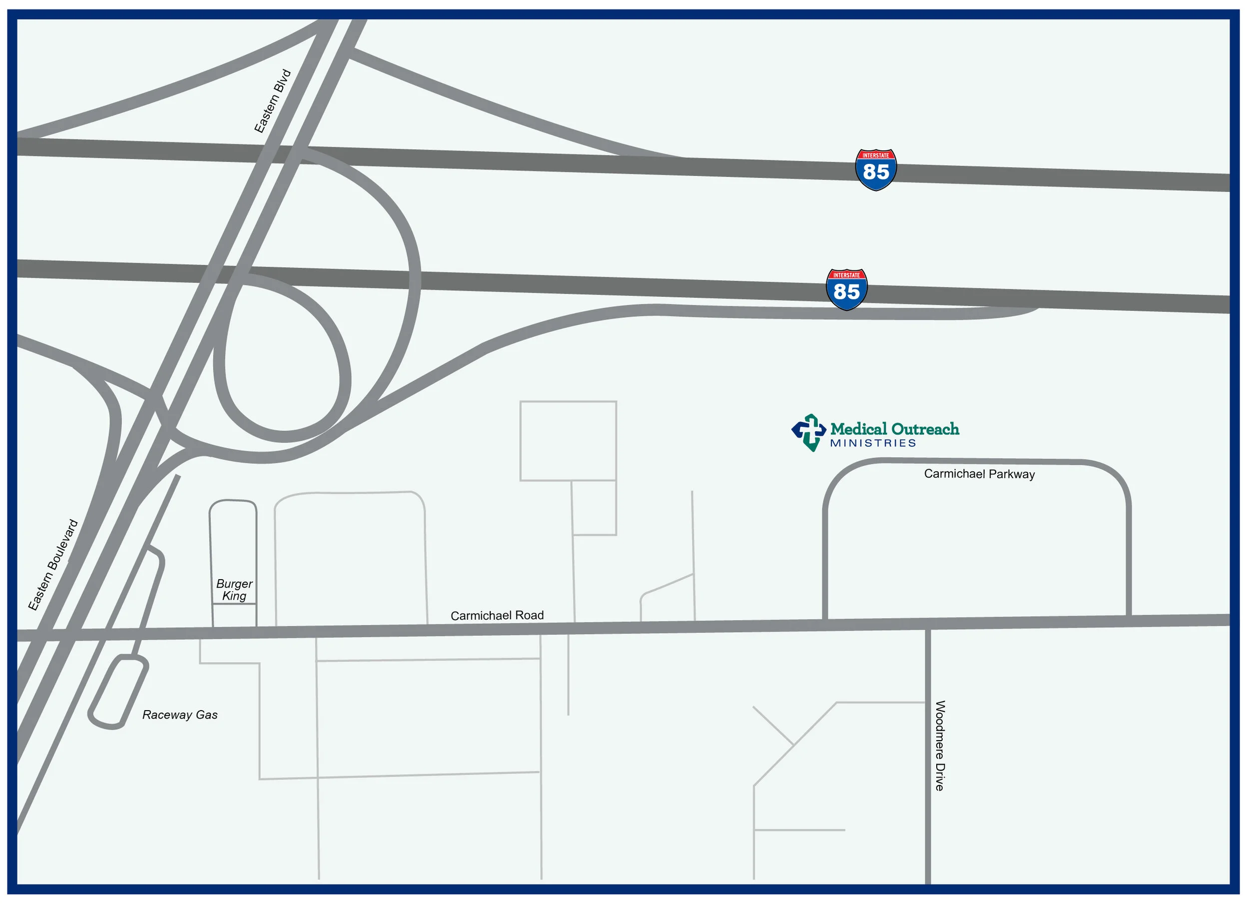 When traveling South on I-85, take Exit 6 East Blvd and turn left onto East Blvd. Cross over the interstate and use the left lane to turn left onto Carmichael Road. Then, turn at the second left onto Carmichael Parkway.